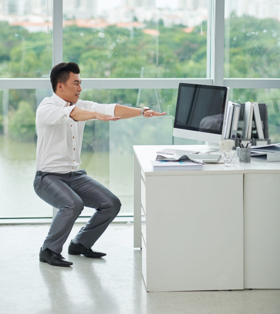 - Pump up with Body WeightStrengthening Exercises – Performing chair or wall squats, desk push-ups, triceps dips, and full body extensions (like a reverse plank) activates large muscle groups and engages the core.